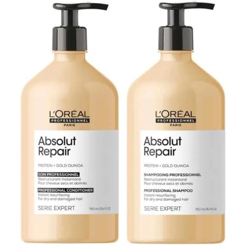 Kit com shampoo e condicionador para cabelos danificados em tamanho profissional. L'Oréal Professionnel Absolut Repair Gold Quinoa + Protein Profissional repara e nutre os fios instantaneamente.