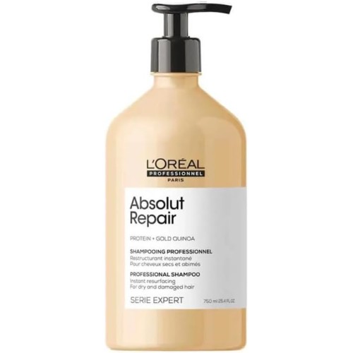 L'Oréal Professionnel Serie Expert Absolut Repair Gold Quinoa + Protein - Shampoo 750ml: reestrutura a fibra capilar, confere brilho e leveza durante a limpeza diária dos fios.