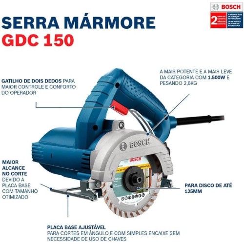 A Serra Mármore a seco Bosch GDC 150 TITAN, é a única ferramenta do mercado que alcanca espaços que as outras não alcançam, além de ser leve e compacta, possui placa-base de fácil ajuste e remoção, alto torque e maior velocidade nas diversas aplicações.