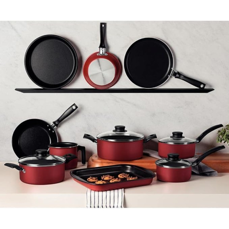 Seja qual for a receita que você vai preparar, é essencial contar com itens de qualidade, como o jogo de panelas Tramontina Turim em alumínio com revestimento interno e externo em antiaderente Starflon Max vermelho 10 peças.